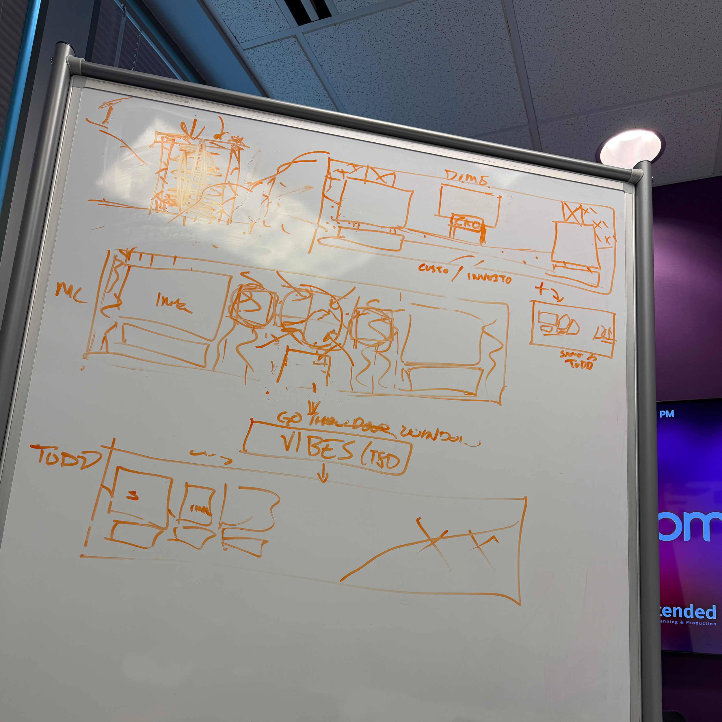 I met with them in their Raleigh HQ to hammer out the details (definitely not going to the wrong building first). I drew on a whiteboard for a bit (always a treat), and we figured out a realistic plan for getting everything done. We decided to build out a few different “worlds” in which the keynotes would happen, with transitions to take us from world to world.